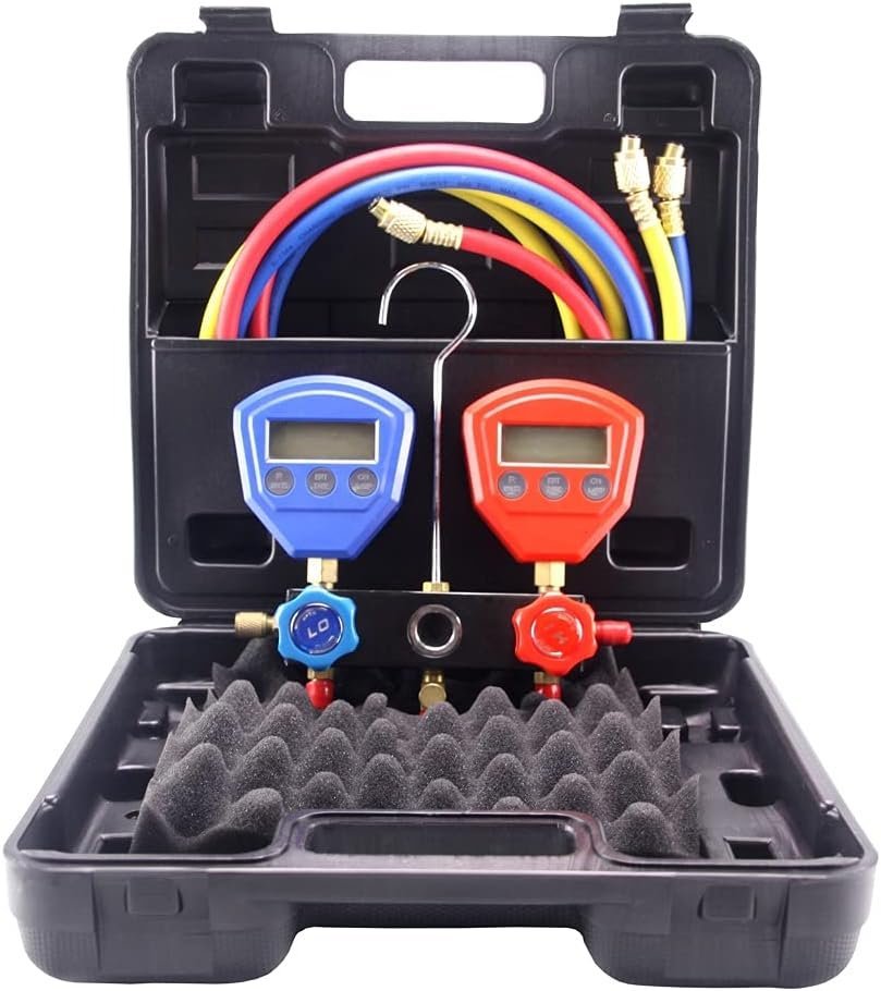 El analizador de 2 válvulas con manómetros digitales es una herramienta utilizada para medir y analizar la presión de gases refrigerantes en sistemas de aire acondicionado y refrigeración. Estos analizadores digitales ofrecen alta precisión y pueden soportar una amplia gama de gases refrigerantes, incluyendo R22, R134A, R404A, R407C y R410A. Algunos modelos también incluyen características como protección anti-golpes, un indicador de nivel y la capacidad de ejecutar mediciones por intervalos de tiempo, lo que permite a los técnicos analizar datos recolectados. Además, vienen con accesorios como mangueras y un estuche para su transporte.