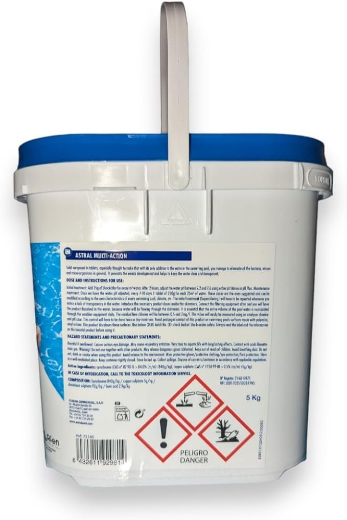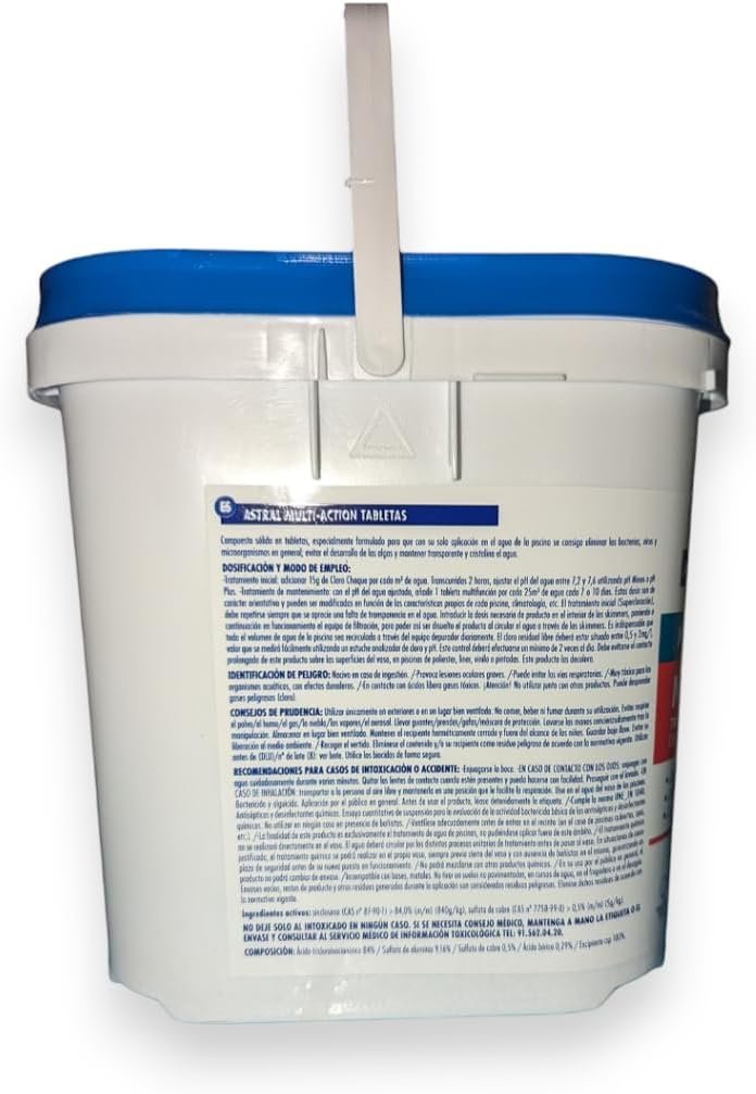 En contacto con ácidos libera gases tóxicos. Muy tóxico para los organismos acuáticos, con efectos nocivos duraderos. Nocivo en caso de ingestión. Provoca irritación ocular grave. Puede irritar las vías respiratorias. ¡Atención! No utilizar junto con otros productos. Puede desprender gases peligrosos (cloro). Utilice los biocidas de forma segura. Lea siempre la etiqueta y la información sobre el biocida antes de usarlo PRODUCTO APTO PARA USO NO PROFESIONAL. LEA SIEMPRE LAS INSTRUCCIONES ANTES DE SU USO. UTILICE SIEMPRE LOS BIOCIDAS CON PRECAUCIÓN. MANTENER FUERA DEL ALCANCE DE LOS NIÑOS