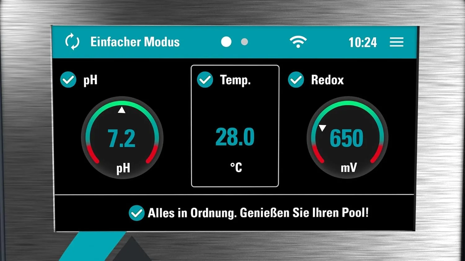 Cuidado completo del agua: cómodo dispositivo completo para un cuidado seguro y automático del agua. Medición y control de pH y cloro para una calidad óptima del agua.