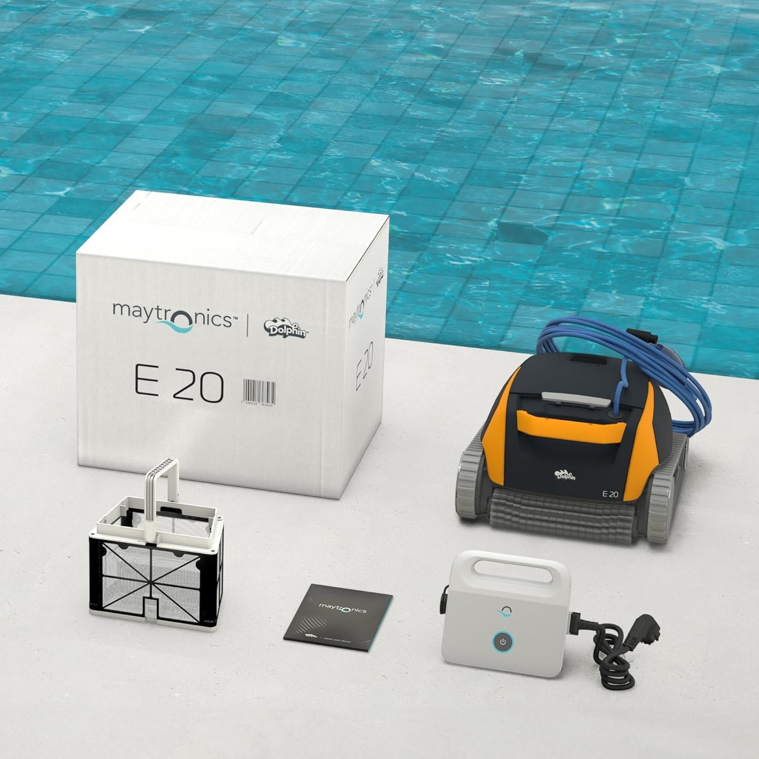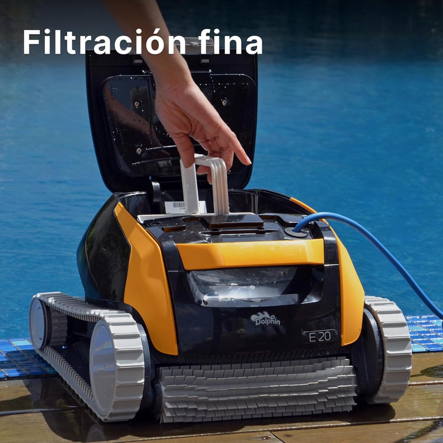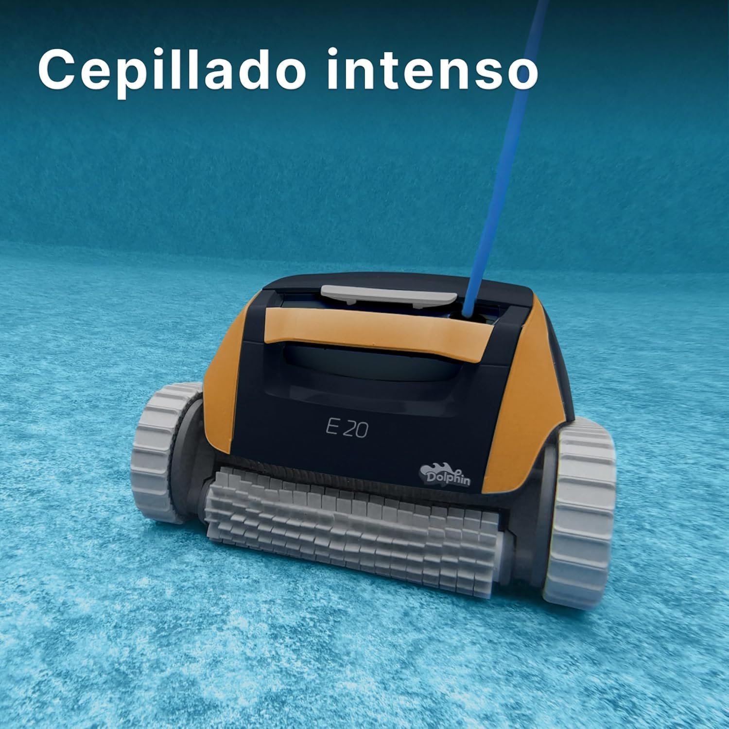El Dolphin E20 es un limpiafondos automático para piscinas enterradas de hasta 10 metros, diseñado para limpiar el fondo y las paredes. Cuenta con un cepillo que elimina eficazmente la suciedad, algas e insectos, asegurando una limpieza completa. Tiene un ciclo de trabajo de 2 horas. El Dolphin E20 es un limpiafondos automático diseñado para piscinas enterradas de hasta 10 metros de longitud. Limpia el fondo y las paredes de la piscina, eliminando suciedad, algas, hojas e insectos. Cuenta con un ciclo de trabajo de 2 horas y un filtro de cartucho de fácil limpieza. Se destaca por su cepillado intenso y escaneo inteligente para una limpieza efectiva. Además, incluye una garantía de 2 años. Es una opción compacta y potente para mantener la piscina impecable.