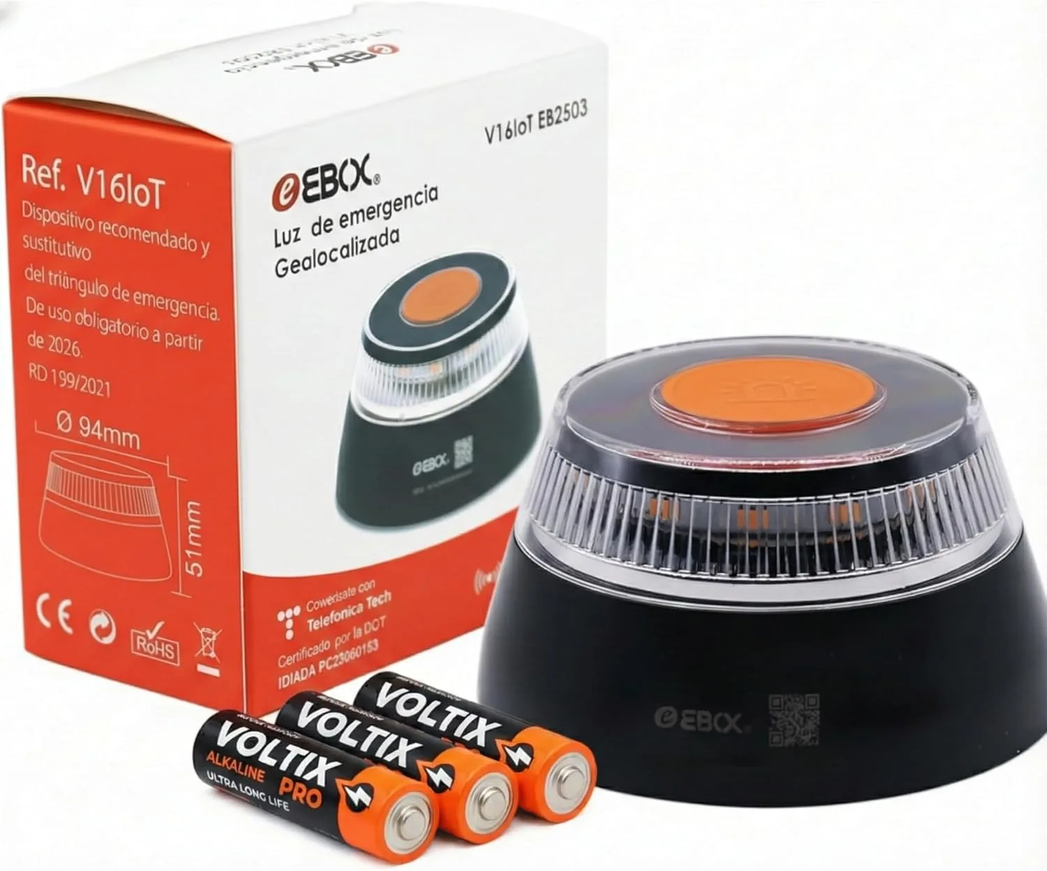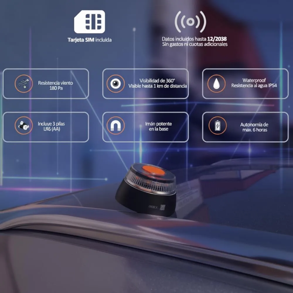 Luz de emergencia V16 Geolocalizada para vehículos. Fabricada conforme a la normativa de seguridad vigente y homologada por laboratorio acreditado IDIADA, según requisitos de la DGT, con número de homologación marcado en la parte inferior del artículo. Incluye una tarjeta SIM conectada con Telefónica Tech, con servicio de comunicación de datos hasta 12 /2038, sin gastos ni cuotas adicionales. De activación manual y con base de fijación magnética. Resistencia al viento de hasta 180Pa, visibilidad 360º -hasta 1 km de distancia y resistencia al agua conforme a estándares IP54. De tamaño compacto para guardar en cualquier compartimento del vehículo y tenerla a mano en caso de emergencia. Manual incluido español.