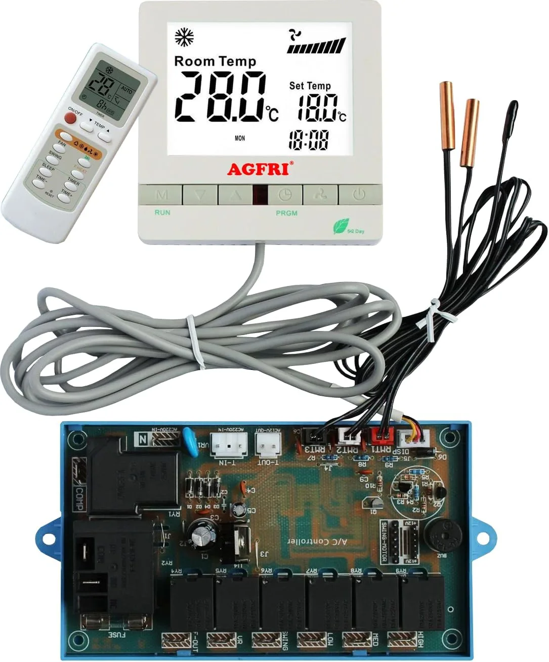 Esta electrónica universal de reemplazo con termostato retroiluminado es la solución perfecta para actualizar o reparar su sistema de climatización. Compatible con prácticamente cualquier máquina del mercado, excepto equipos inverter, este sistema de control ofrece versatilidad y funcionalidad avanzada. Incluye un cable de 1.9 metros que facilita la instalación, junto con un mando a distancia para mayor comodidad de uso. El termostato retroiluminado permite una lectura clara incluso en condiciones de poca luz. Equipado con 6 relés para maniobras y un receptor externo, proporciona un control completo de las funciones de su equipo. La función de auto-arranque garantiza que el sistema se reinicie automáticamente después de un corte de energía. Ofrece amplias posibilidades de personalización y ajustes para adaptarse a sus necesidades específicas de climatización. Ideal para técnicos profesionales y usuarios que buscan una solución de control confiable y completa para sus sistemas de calefacción, ventilación y aire acondicionado.