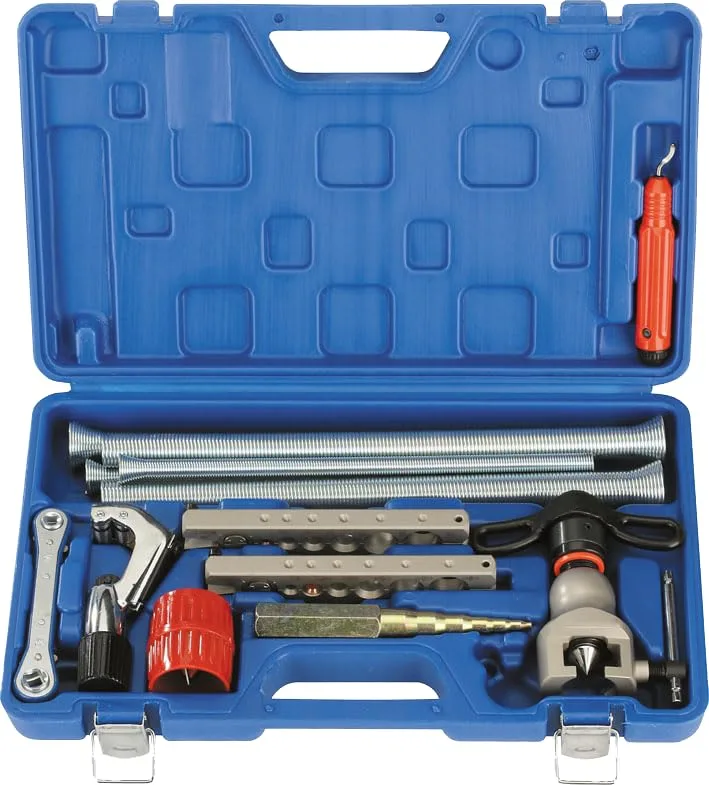 Este completo kit de herramientas para tubos de 13 piezas es la solución profesional ideal para trabajos de fontanería, refrigeración y climatización. El conjunto incluye un abocardador AB806A con capacidades para tubos de 6mm, 8mm, 10mm, 12mm, 16mm y 19mm de diámetro exterior, equipado con embrague para mayor precisión. El cortatubos CT-274 permite cortes limpios en tubos de 4 a 28mm, mientras que el escariador BT-209 trabaja eficientemente en diámetros de 3 a 41mm con cuchilla giratoria. La llave carraca BT-122 ofrece versatilidad con medidas de 3/8″, 5/16″, 1/4″ y 3/16″. El kit también incorpora un abocardador de golpe BT-96 para diversos diámetros, un limpiador escariador BT-207, y muelles dobladores de tubos BT-102K para tubos de 5/16″ hasta 3/4″ de diámetro exterior. Todas las herramientas vienen organizadas en un práctico maletín de plástico resistente que facilita el transporte y almacenamiento, manteniendo su equipo protegido y siempre listo para usar. Perfecto para profesionales y aficionados que buscan calidad y funcionalidad en un solo conjunto.