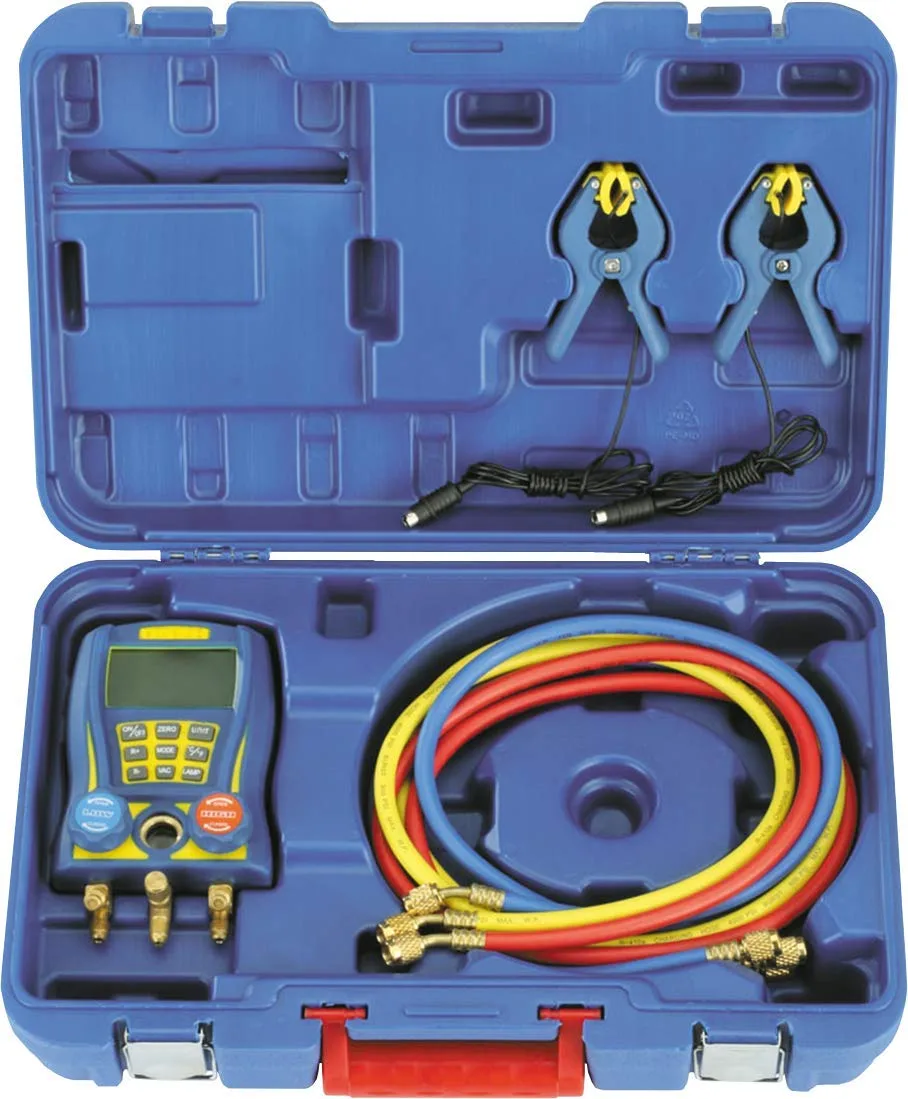 MANÓMETRO DIGITAL PROFESIONAL: Sistema de 2 válvulas con alta precisión para mediciones exactas de presión en sistemas de refrigeración y aire acondicionado