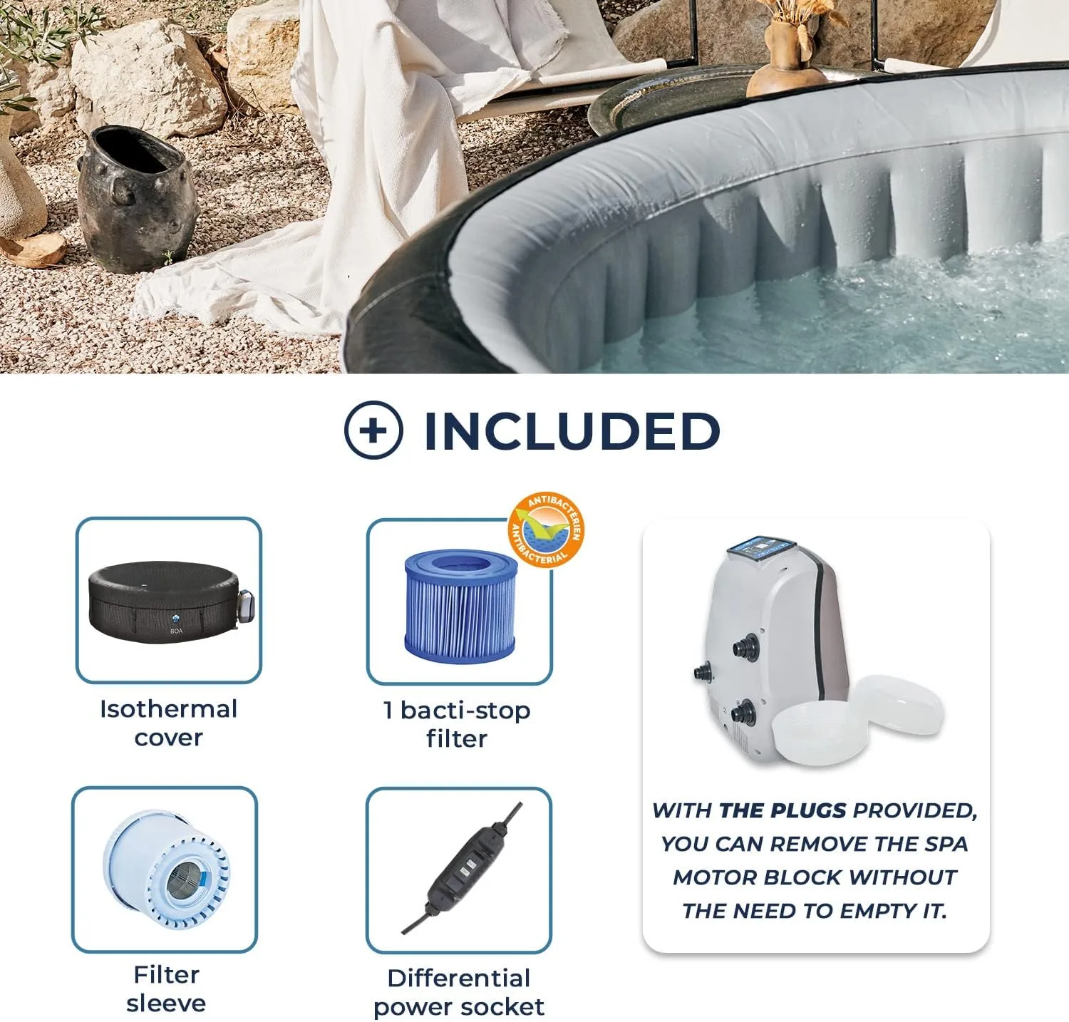 PRÁCTICO: el Spa hinchable SP-BOA155B es el tipo de spa que se puede mover, ya que es fácil de inflar y desinflar, pero también porque es muy ligero. Es muy fácil de mover y llevar en fin de semana o de vacaciones