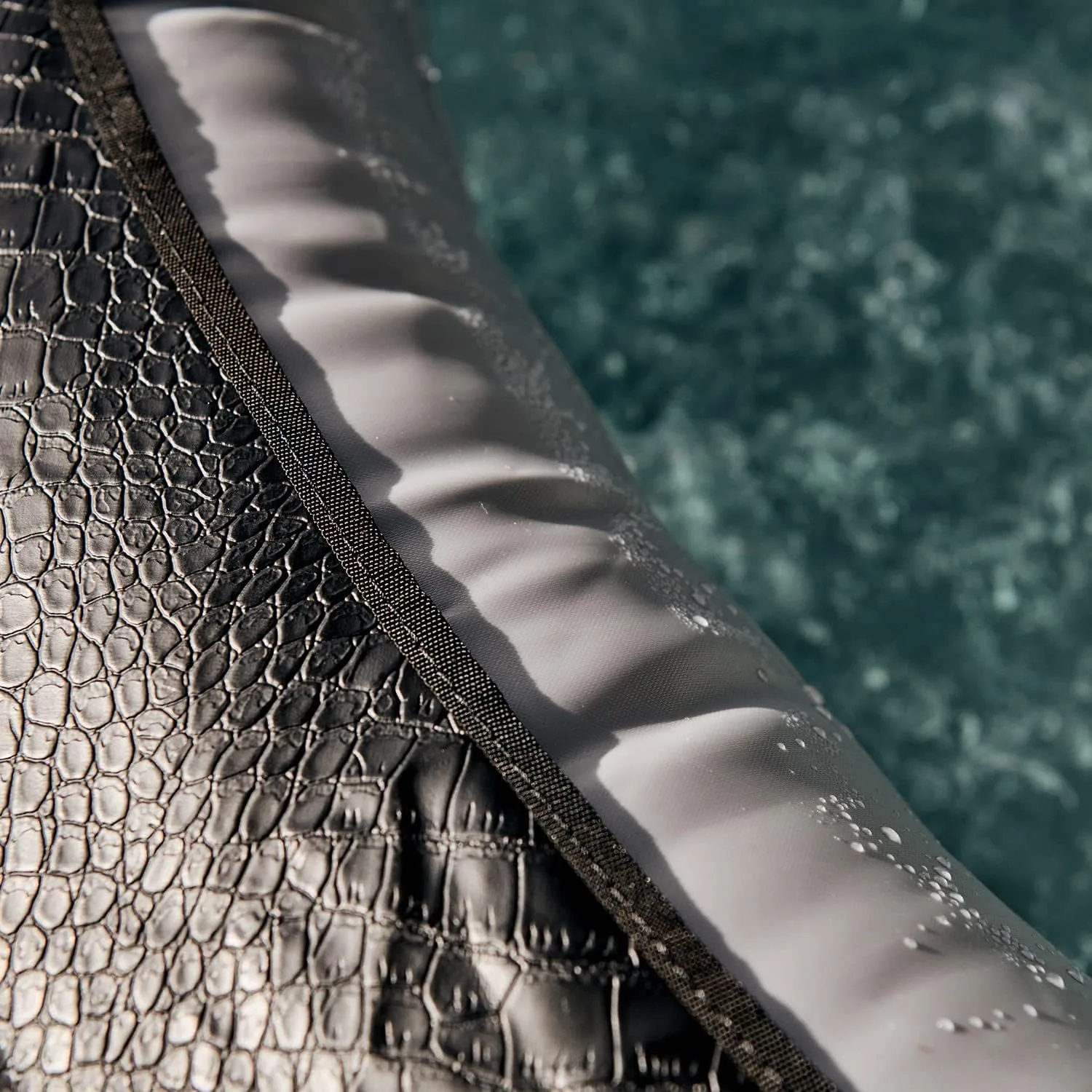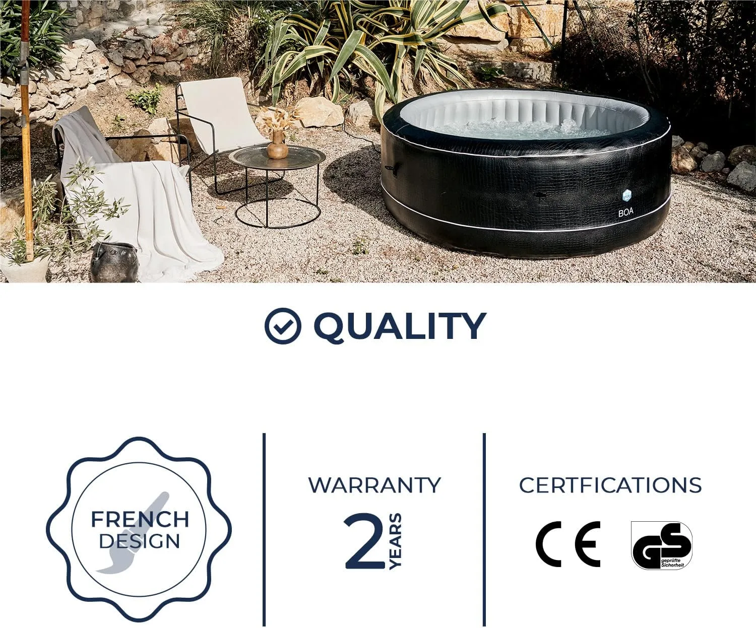 SPA HINCHABLE SP-BOA155B: de forma circular en XL familiar, tiene un revestimiento efecto de cocodrilo. También llamado Spa BOA, dispone de 5 a 6 plazas, y equipado con el bloque motor Netspa. Su estructura de espuma es de 8 cm